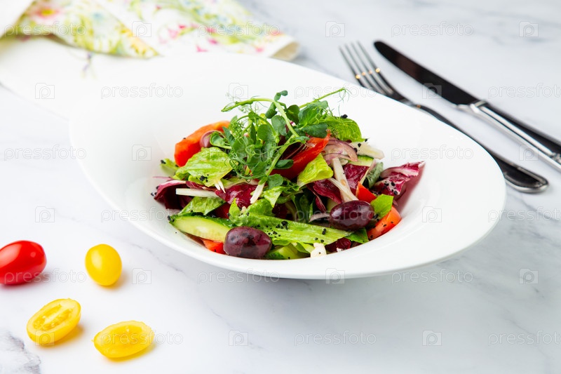 Салат из зелени, листьев салата, огурцов, розового лука, вид сбоку