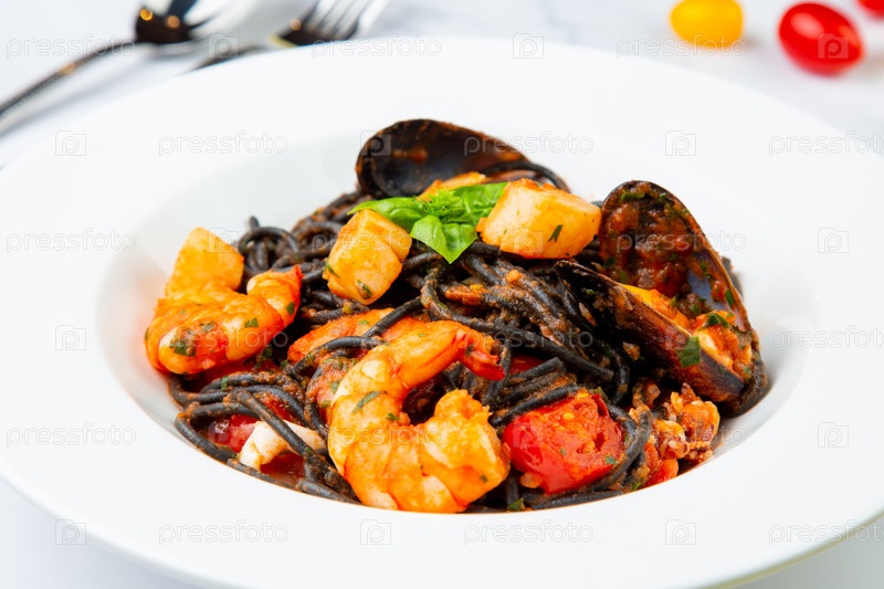 Черная лапша с мидиями, креветками, помидорами и зеленью, вид сбоку