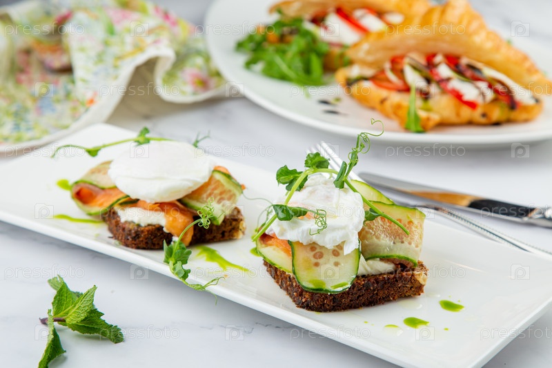 Канапе на черном хлебе с сыром, красной рыбой, зеленью и огурцом, вид сбоку