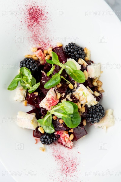 Салат из ежевики, свеклы, семян и сыра, вид сбоку на белой тарелке