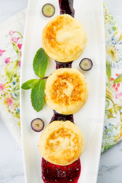 Пышные и высокие чизкейки с вареньем и мятой на белой тарелке, вид сверху