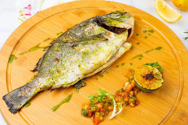 Запеченная рыба со специями и лимоном на деревянном подносе, вид сбоку