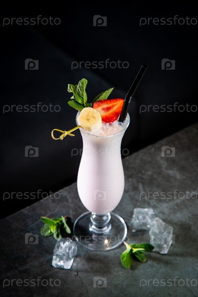 Молочный коктейль с клубникой, бананом, мятой и льдом, вид сбоку