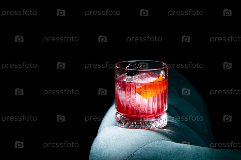 Красный коктейль с ягодным сиропом и круглым льдом с видом сбоку ежевики