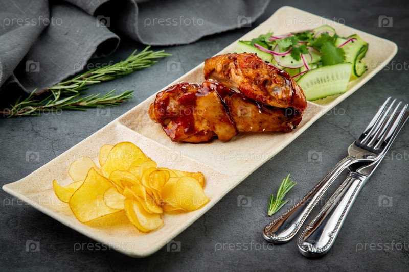 Европейское блюдо. Курица в соусе, с жареным картофелем и салатом из огурцов, зеленью и луком. темный фон