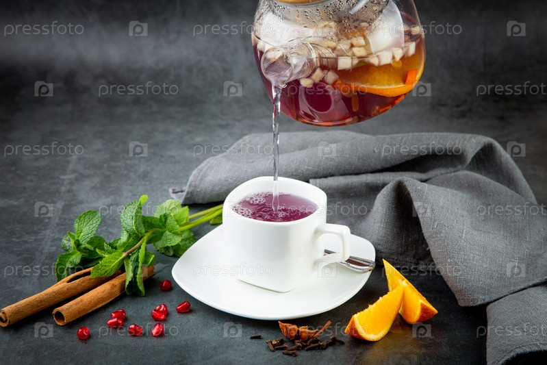 Горячий домашний чай с корицей, лимоном и мятой