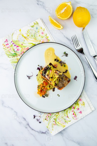 Красная рыба с овощным соусом и пюре на круглой тарелке, вид сверху