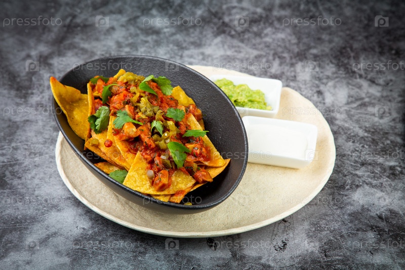Начос с соусом, мясом и зеленью в черной тарелке, вид сбоку