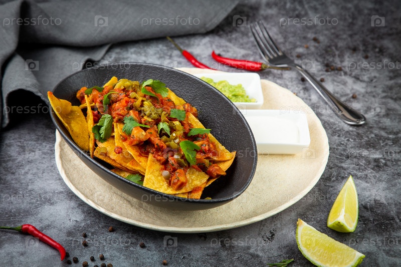 Начос с соусом, мясом и зеленью в черной тарелке, вид сбоку