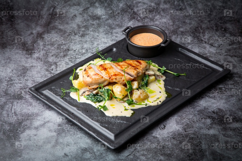 Вид сбоку куриной грудки в сырном соусе с зеленью на черном подносе