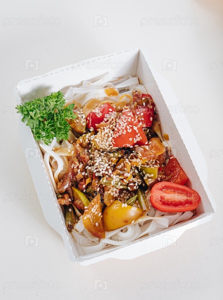 Мясо с фасолью, зеленью, помидорами черри и соусом в контейнере, вид сверху