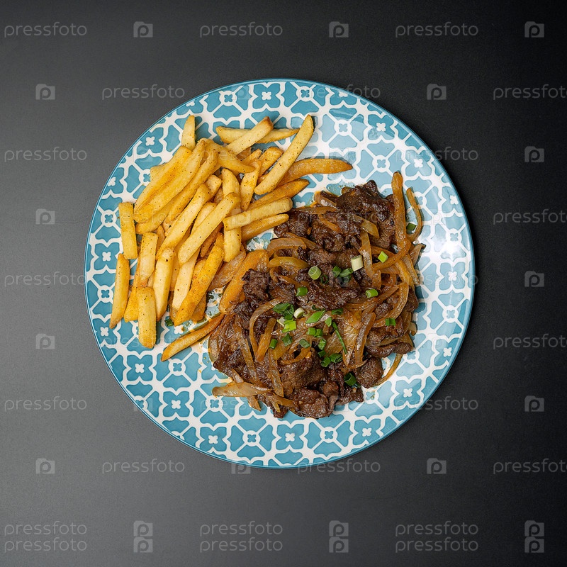 Котел для шашлыка с картофелем фри на темном фоне, вид сверху
