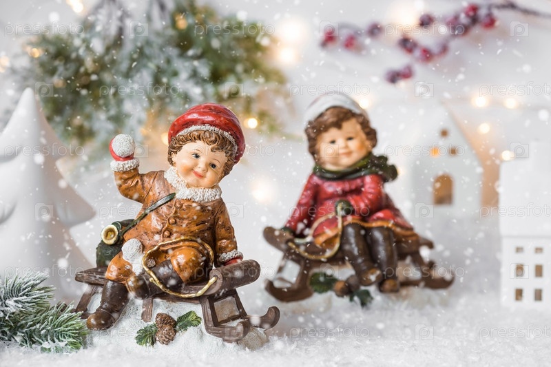 Ретро-рождественская открытка с милыми фигурками детей на деревянных санях на заснеженном фоне. Красивое боке. Концепция зимнего праздника Нового 2024 года