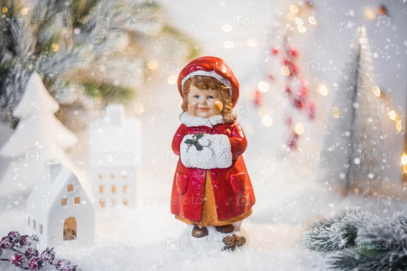 Рождественская открытка в стиле ретро с милой фигуркой ребенка на заснеженном фоне. Девушка в красном пальто греет руки в муфте. Концепция зимнего праздника Нового 2024 года