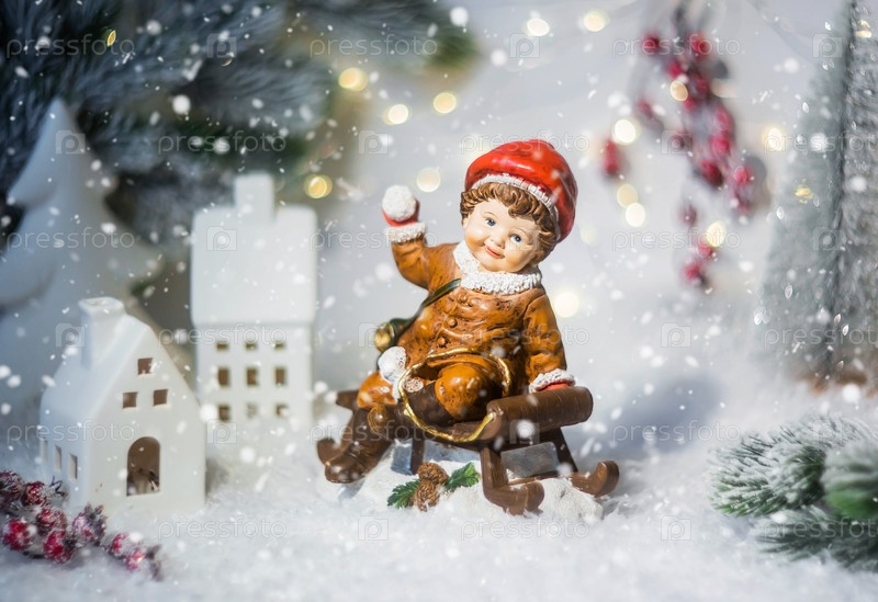 Ретро-рождественская открытка с милой фигуркой ребенка на деревянных санях на красивом заснеженном фоне. Мальчик Б играет в снежки. Концепция зимнего праздника Нового 2024 года
