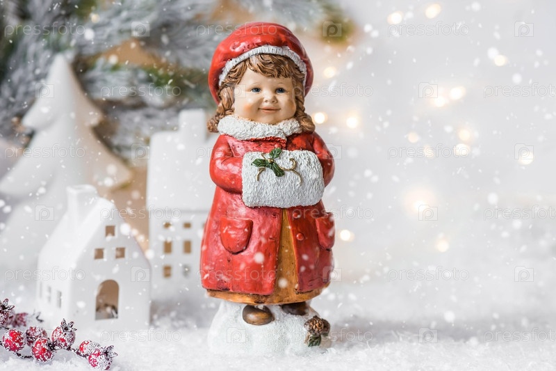 Рождественская открытка в стиле ретро с милой фигуркой ребенка на заснеженном фоне. Девушка в красном пальто греет руки в муфте. Концепция зимнего праздника Нового 2024 года