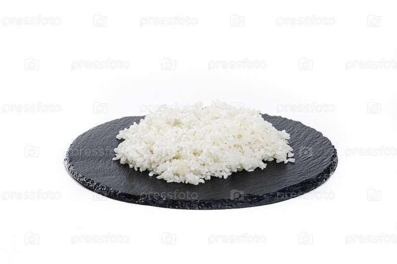Вкусный изолированный белый рис на черной тарелке. Вид сверху. Китайская кухня, ингредиент для тушеного мяса