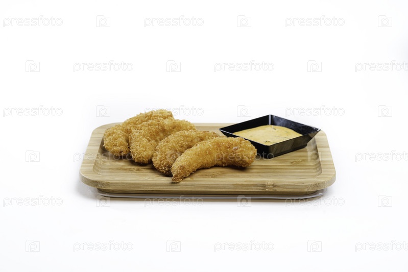 Изумительные жареные креветки с восхитительным соусом на деревянной тарелке. . Вид сверху. китайская кухня