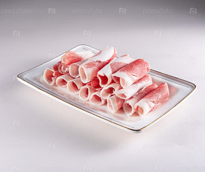 Свежие и эстетичные булочки с беконом на белой тарелке. Вид сверху. Китайская кухня, ингредиент для тушеного мяса