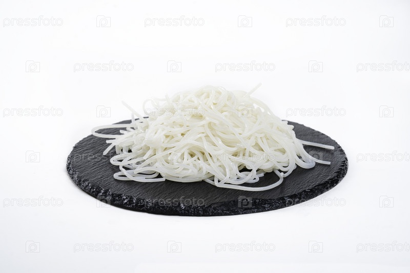 Удивительная и вкусная рисовая лапша на черной тарелке. Гарнир. Вид сверху. Китайская кухня, ингредиент тушеного мяса