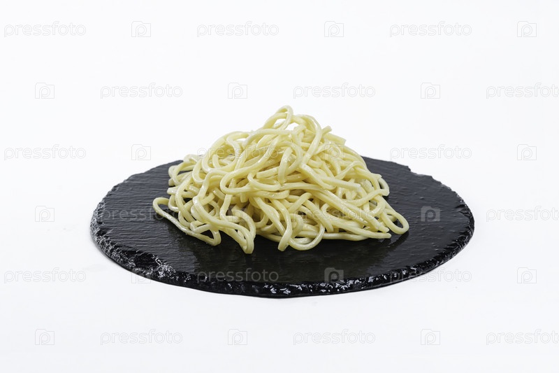 Вкусная яичная лапша на черной тарелке. Гарнир. Вид сверху. Китайская кухня, ингредиент тушеного мяса
