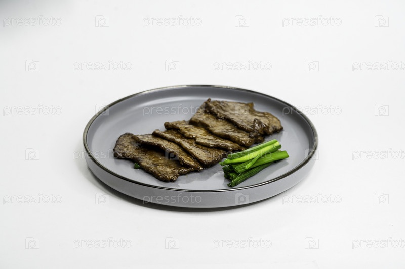 Шанхайский стейк из говядины с зеленым луком на серой тарелке