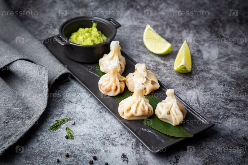 Хинкали — грузинское блюдо, приготовленное на пару из теста и говяжьего фарша. Национальная кухня, темный фон