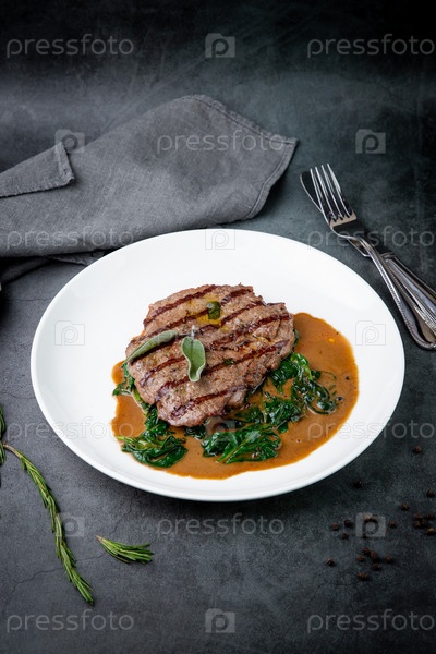 Стейк из говядины с соусом и зеленью на белой тарелке, вид сверху