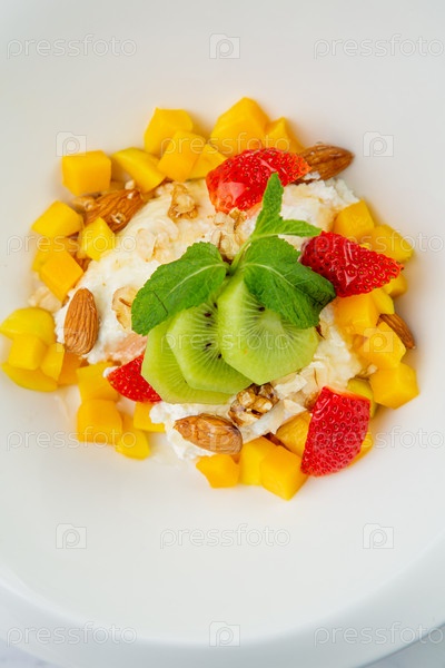 Фруктовый салат с киви, клубникой, манго и орехами в глубокой тарелке, вид сверху