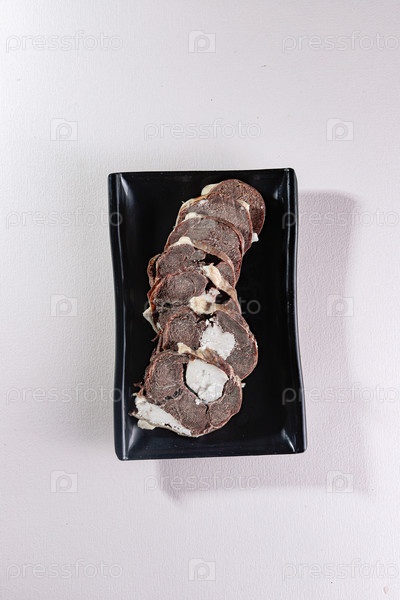 Конина казы на черной тарелке. Вид сверху. Китайская кухня, ингредиент для тушеного мяса