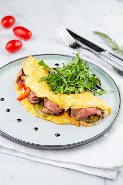 Завтрак из яиц с мясом, зеленью и каплями соуса на круглой тарелке, вид сбоку