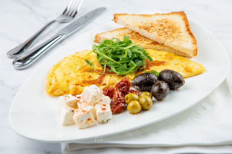 Завтрак из яиц с мясом, зеленью и каплями соуса с хлебом в круглой тарелке