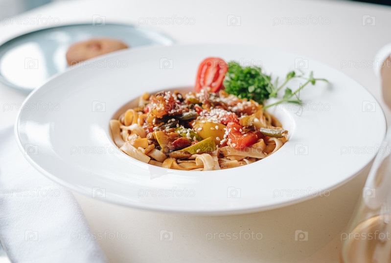 Лапша удон с кунжутом и травами на белой тарелке, вид сбоку