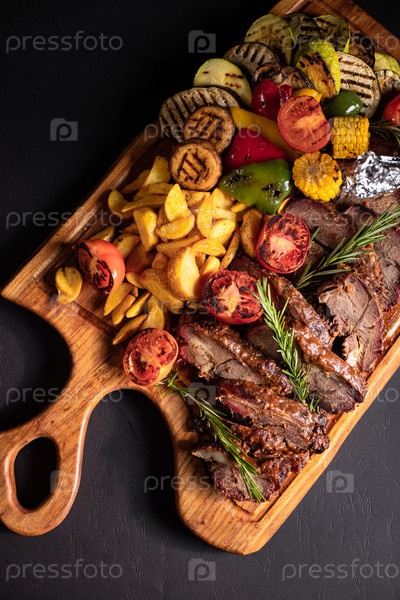 Жареные кусочки стейка с овощами на гриле на деревянном подносе