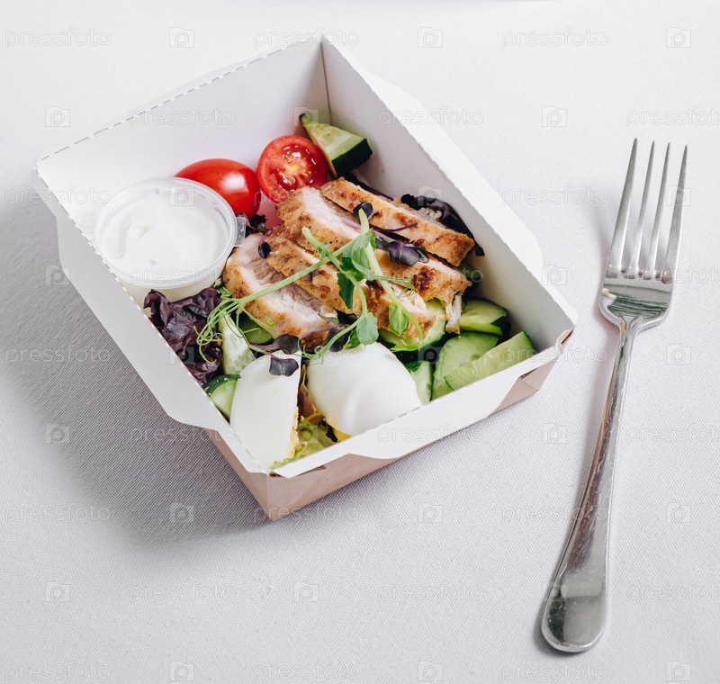 Кусочки курицы с овощами, зеленью и соусом в ланчбоксе