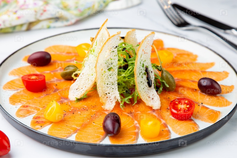 Тонко нарезанные кусочки копченого лосося с помидорами черри, оливками и зеленью на белой тарелке. вид сверху
