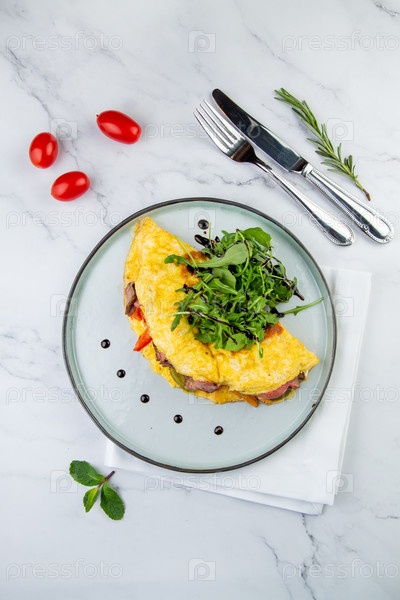 Завтрак из яиц с мясом, зеленью и каплями соуса в круглой тарелке
