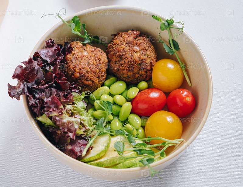 Миска в китайском стиле. фрикадельки с фасолью, зеленью, помидорами черри и соусом в миске