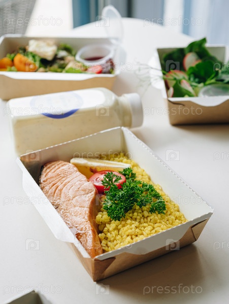 Еда в контейнерах. правильное питание, ежедневный рацион, похудение. зелень, помидоры, лимон, стейк лосося с гарниром из кускуса. Вид сверху
