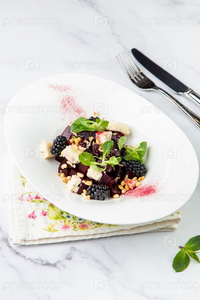 Салат из ежевики, свеклы, семян и сыра, вид сбоку на белой тарелке