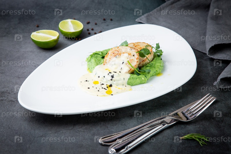 Сырники со сливочным соусом на пюре из брокколи, вид сбоку