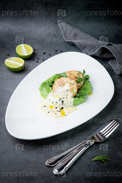 Сырники со сливочным соусом на пюре из брокколи, вид сбоку
