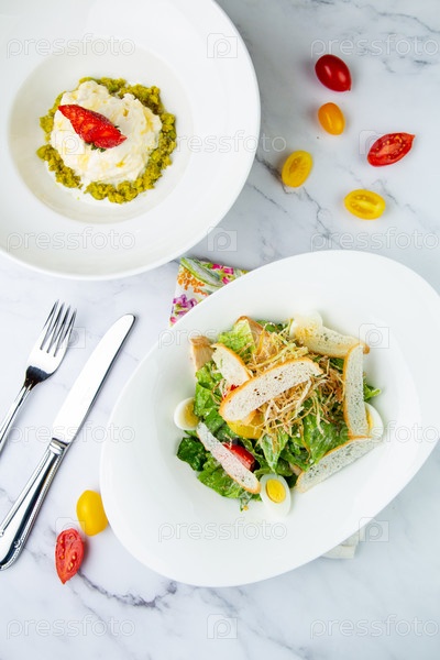 Салат с перепелиными яйцами, помидорами черри, салатом и сухарями, вид сверху