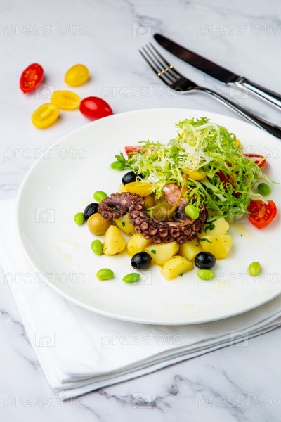 Салат с оливками, зеленью, помидорами черри, картофелем и щупальцами осьминога, вид сбоку