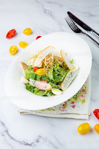 Салат с перепелиными яйцами, помидорами черри, салатом и сухарями, вид сбоку