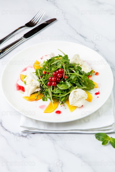 Зеленый салат с рукколой и брусникой на белой тарелке и мраморном фоне, вид сверху