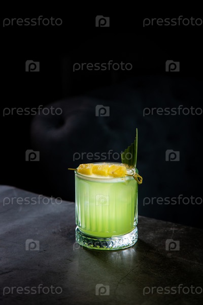 Коктейль из лайма с кусочками ананаса и корицей, вид сбоку