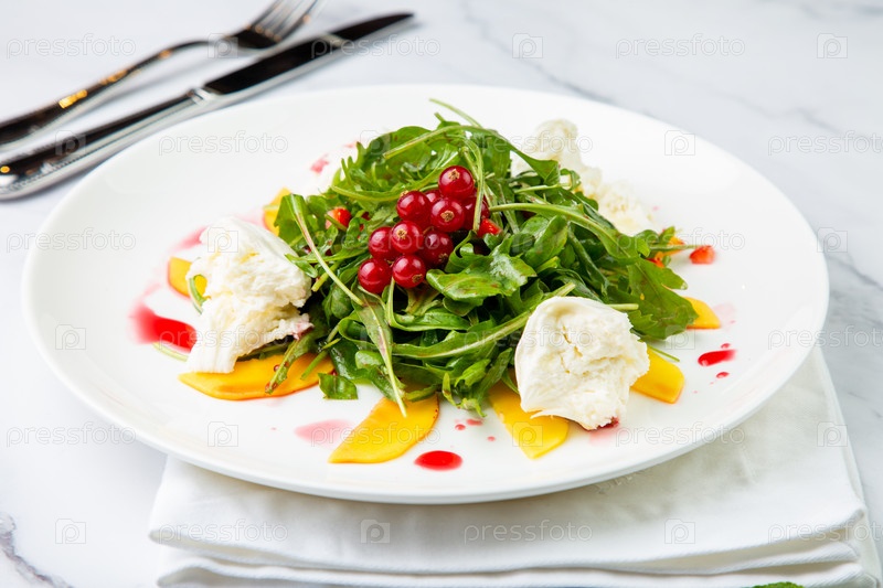 Зеленый салат с рукколой и брусникой на белой тарелке и мраморном фоне, вид сверху