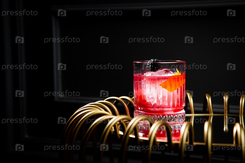 Красный коктейль с ягодным сиропом и круглым льдом с видом сбоку ежевики