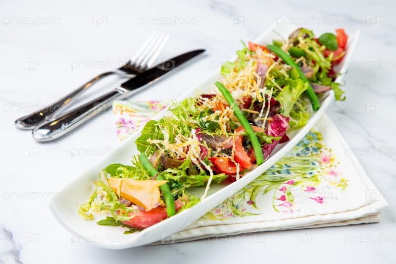 Салат с зеленью, рукколой, цветным перцем и свеклой на белой тарелке, вид сбоку